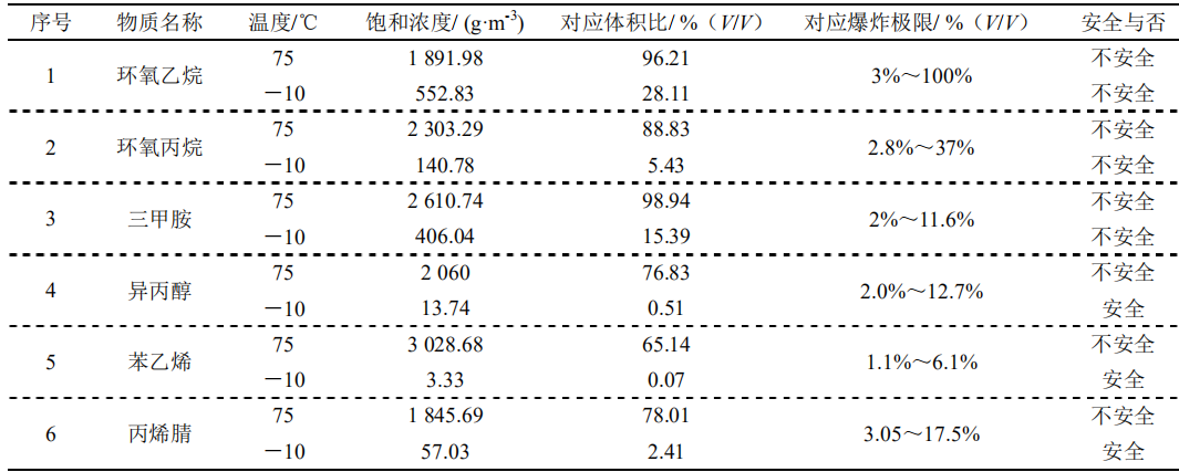 如表1所示,當(dāng)真空泵出口尾氣溫度為75℃時,每種有機物質(zhì)的飽和濃度理論上非常高。如果廢氣稀釋率不足,很容易引起安全事故。單套PL真空泵的環(huán)氧乙烷泄漏量約為120m3/h,三個真空泵的總流量為360 m3/h。事故發(fā)生時焚燒爐的實際處理風(fēng)量也不超過5000m3/h,2.4%的平均濃度在相應(yīng)的爆炸范圍內(nèi)??梢姀U氣排放真空泵出口溫度過高,有機材料沸點低,導(dǎo)致有機廢氣濃度高。與此同時,相應(yīng)的稀釋倍數(shù)不夠,再加上環(huán)氧丙烷和環(huán)丙烷,氧乙烷化學(xué)性質(zhì),最終達到有機成分的相應(yīng)爆炸極限,造成爆炸事故。